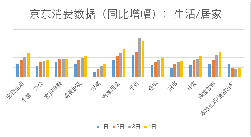 外出旅游如火如荼,“宅”在家中的朋友也不甘寂寞,趁着长假期间在京东平台上为自己、家人或朋友挑选称心的商品无疑是最佳的选择。宠物生活、电脑、母婴、美妆护肤、汽车用品、手机数码等商品的销量在1-4日内持续增长,其中受“京东超级品牌日”等因素影响,手机类商品的销售增长在3日达到峰值;有意思的是,一些看似与节日无关的消费如图书、钟表等相比去年也有较大的涨幅,体现了消费者的多元化需求;而国庆期间的“结婚潮”则拉高了珠宝首饰的相关销售。