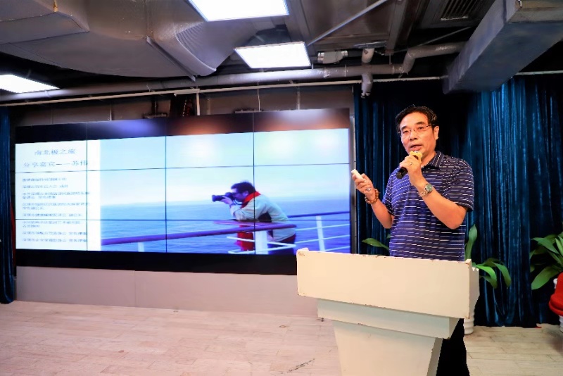 苏伟老师在现场介绍:10月15日对深圳来说是一个极其不平凡的日子,上午在深圳举办了首届“中国海洋第一展”暨“2019中国海洋经济博览会”在深圳会展中心隆重开幕,下午由中国自主建造的首艘极地科学考察破冰船“雪龙2”号在蛇口港出发首航挺进南极,特别机缘巧合的是我今晚分享的内容就是南北极旅游。为什么用“画”极地,而不是“话”极地,这是因为,地球有三极,除了南北极外,还有“珠峰”就是第三极。而我们三个六十年的老男人,在苏伟老师的鼓动下,三个人用不到三年的时间,踏访了这“三极”。如果要展开讲,恐怕三天三夜也讲不完。所以,“画”极地,就是用照片,讲一下照片背后的故事。