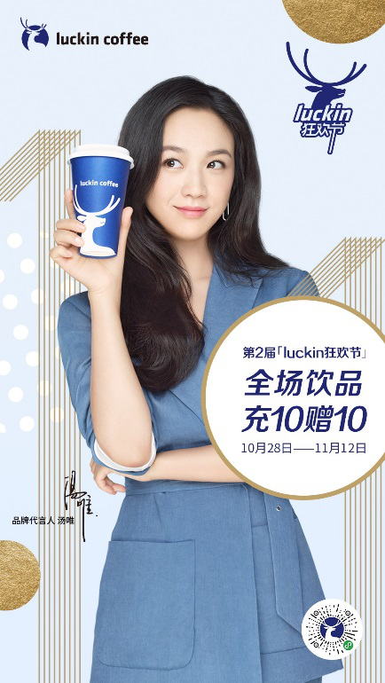 本次2019年双11第2届luckin狂欢节,长达16天的“充10赠10”的超大力度优惠,同时叠加周边产品88折、“瑞幸X优酷特惠套餐”等多重活动。不但优惠力度堪称最大,同时,包括汤唯、肖战和冯唐等各种明星名人IP联名潮流周边产品的参与打call,也让这届luckin狂欢节异彩纷呈,堪称国内咖啡连锁行业内最受瞩目,也是饮品行业力度最大的双11促销。