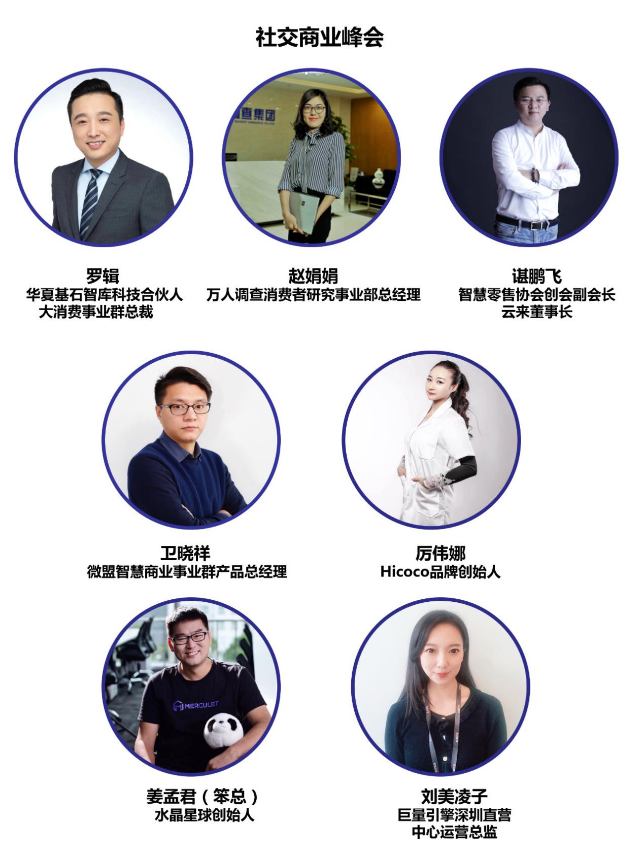 10月30日14:00—17:00(宴会厅Ⅲ)举行社交电商峰会,华夏基石智库科技合伙人、大消费事业群总裁罗 辑主持峰会。万人调查消费者研究事业部总经理赵娟娟演讲主题《2019年深圳市消费者线上线下渠道消费洞察》,智慧零售协会创会副会长、特聘专家;云来董事长谌鹏飞演讲主题《私域流量社交商业模式解码》,微盟智慧商业事业群产品总经理卫晓祥演讲主题《企业布局社交电商的四种模式》,Hicoco品牌创始人厉伟娜演讲主题《说说美业那些事》,水晶星球创始人姜孟君演讲主题《社群时代的影响力和业绩增长》,巨量引擎深圳直营中心运营总监刘美凌子演讲主题《D造营销新零售助力品牌升级布局》