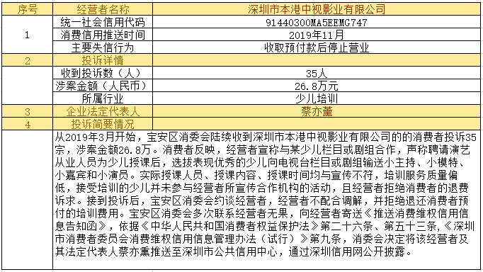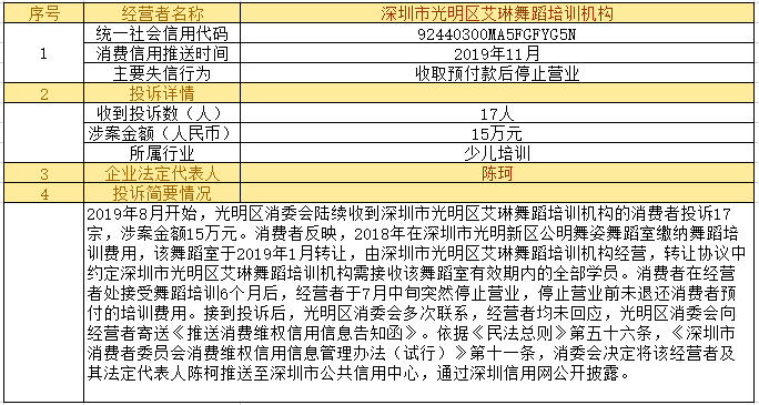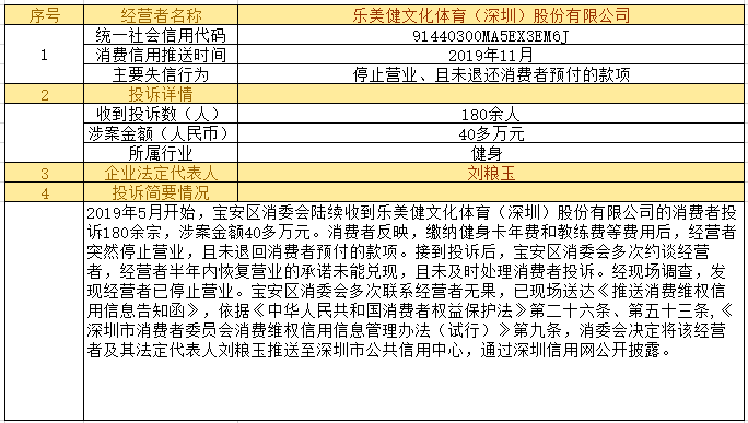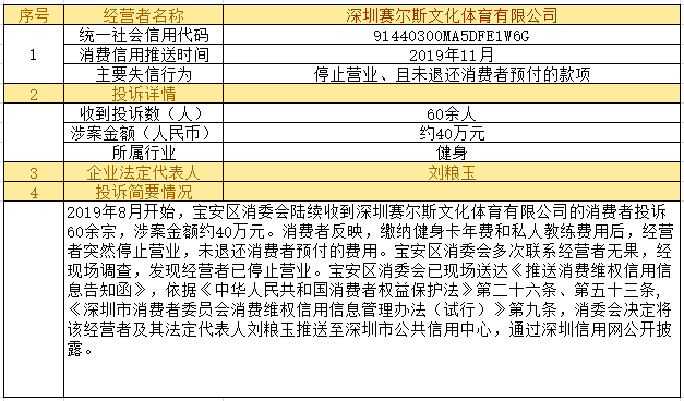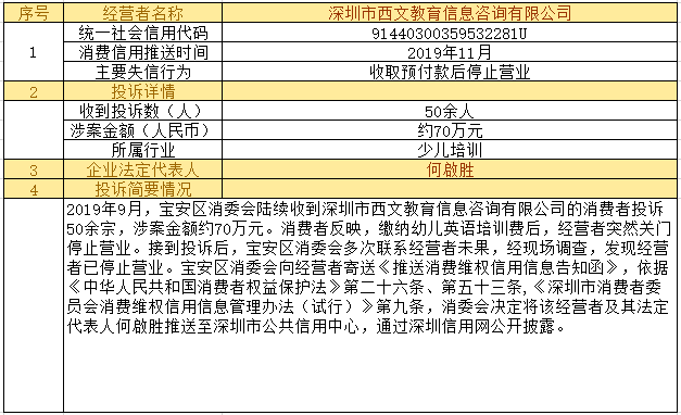 深圳新闻网2019年11月8日讯11月7日,为加强对商品和服务的社会监督,推进消费领域信用体系建设,深圳市消委会联合宝安区消费者委员会(以下简称“宝安区消委会”)、龙岗区消费者委员会(以下简称“龙岗区消委会”)和光明区消费者委员会(以下简称“光明区消委会”)将六家预付式消费领域“跑路”、未按约定退还消费者预付款项的经营者及其主要负责人推送至深圳市公共信用中心,通过深圳信用网公开披露。下一步,对于此次推送的损害消费者合法权益的经营者,消委会将支持受损害的消费者提起诉讼,形成“一处失信、处处受限”的全方位信用监督、联合惩戒和约束机制。