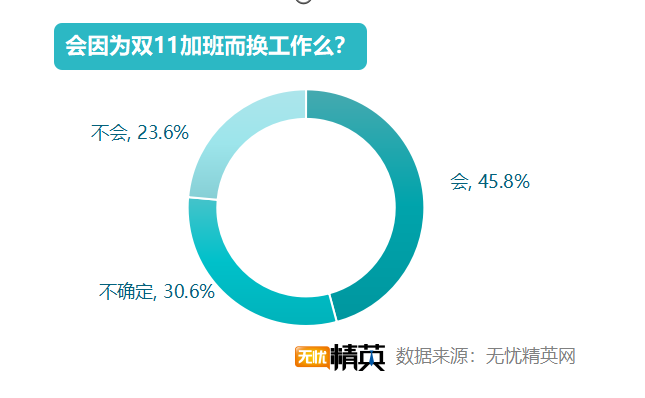 双11过于辛苦,不少人会有工作上逃离双11的想法。45.8%的职场精英因为双11加班过多,会有换工作的想法,不过,较2018年50.6 %的人有这种想法,已有所下降;30.6%的精英不确定要不要换工作,23.6%的职场精英则表示不会因为双11加班多而换工作。