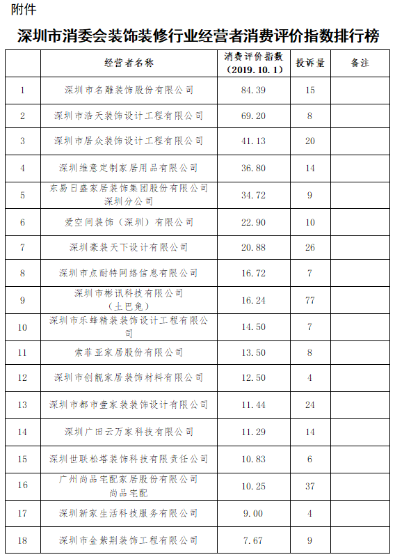 11月20日,深圳市消费者委员会(以下简称“深圳市消委会”)首次发布深圳市消委会装饰装修行业消费评价指数排行榜。榜单旨在敦促装饰装修行业经营者提升商品和服务质量,为消费者提供装饰装修消费指引,营造安全放心的消费环境。
