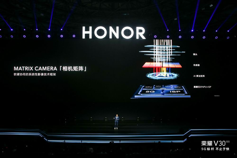 大幅提升的影像能力是荣耀V30在5G之外的另一大看点。此前在网络上已经有传言的Matrix Camera突破性相机矩阵得到了赵明的证实,这是一种软硬协同的技术框架,通过分布式的RAW域AI算法矩阵,借助自研达芬奇架构NPU和麒麟ISP强大处理能力,与联合设计的光学系统深度融合,带来综合影像能力质的提升。其中包括全方位的影像能力提升,例如可以媲美亿级像素的超清模式;极暗光下的高感光能力与低噪点控制,ISO超感光能力高达409600;电影级五轴视频智慧防抖;突破性的视频HDR能力;以及此前已经被曝光过的卓越暗光摄像能力。