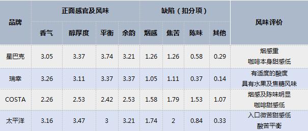而20位咖啡达人对4款美式咖啡的整体风味评价也不尽相同:瑞幸有适度的酸度,具有水果及焦糖风味,接受程度最高;星巴克烟感重,咖啡本身甜感低;COSTA烟感及陈味明显,酸酐较强,咖啡甜感低;太平洋入口微苦甜感低,酸苦较平衡。