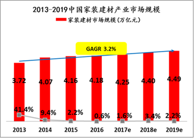 亿欧智库数据显示,目前家装市场复合年增长率维持在3.2%,2019年家装市场销售规模接近4.5万亿,但家装建材互联网渗透率小于10%,经营模式以传统的区域性“散打”为主,无法满足90后主体消费者互联网化、社交化、全国性购买的需求,家装行业大整合的呼声越来越高。