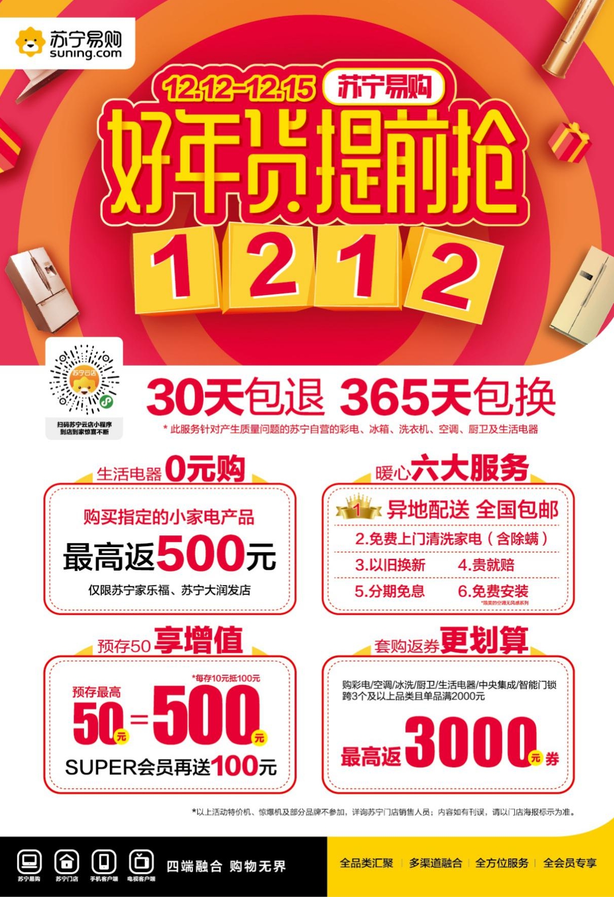 同时,深圳苏宁还联合各大知名品牌为广大消费者推出了多重超强福利,在活动力度上,预存50元可抵500元的家电购物抵用券,并且套购多个产品最高可返3000元的优惠券。除此之外,苏宁家乐福、苏宁大润发、苏宁欧尚联合推出生活家电0元购活动,消费者购买生活电器可返产品价格的同等金额,最高省500元。并且双十二当天在苏鲜生购物使用苏宁金融支付新用户满50元减20元,老用户满30元减10元,12月15日在苏宁小店购物使用翼支付还可享5折立减。可以预见,从产品、价格、服务、活动各个方面不断提升消费者购物体验的深圳苏宁将成为消费者选购年货的不二选择。(吴艳)