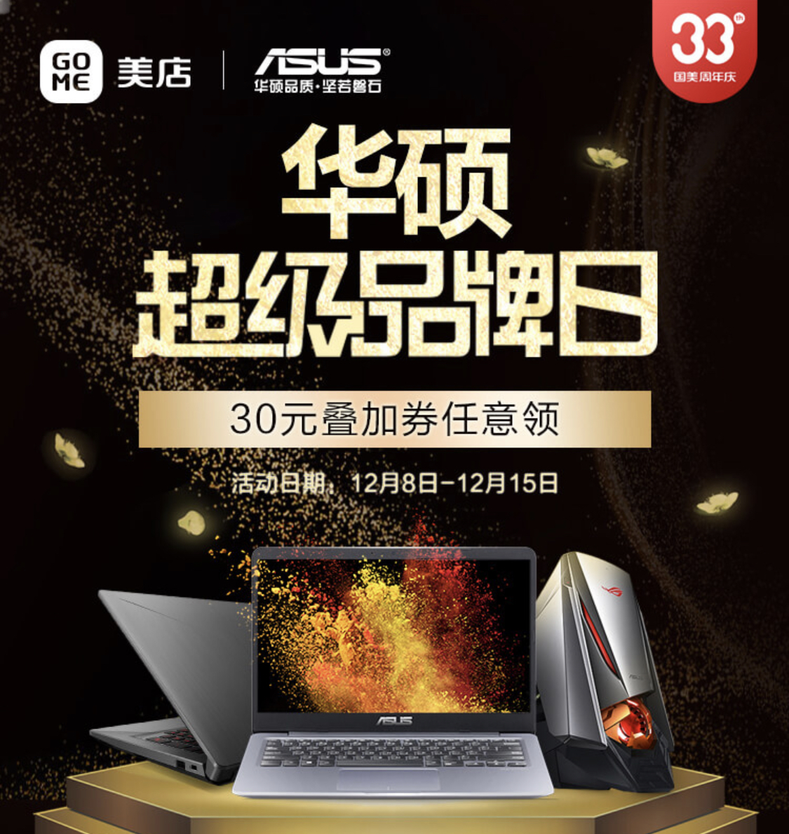 国美33周年华硕超级品牌日,游戏、办公、轻薄颜值笔记本电脑应有尽有,全场产品可领30元无门槛可叠加优惠券,相当于在原有优惠基础上再降30元。