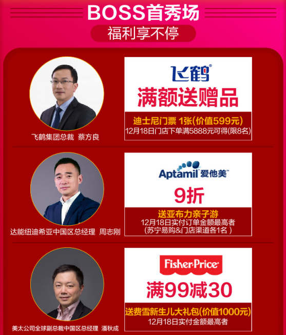 12月18日,苏宁红孩子打造了线上线下双线齐发的“年终狂欢抢购盛典”。母婴品牌大佬带头发福利,飞鹤集团总裁蔡方良、达能纽迪希亚中国区总经理周志刚、美太公司全球副总裁中国区总经理潘秋成、宝洁大中华区帮宝适副总裁任远,金佰利大中华区董事总经理Mike等豪送价值十万大礼。活动当天,购相应品牌产品且实付金额最高者就能将戴森吹风机、老凤祥黄金、迪士尼门票等大礼免费带回家。
