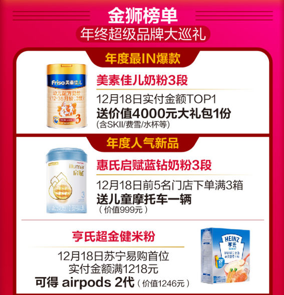 苏宁红孩子金狮榜单上,年度最IN爆款、人气新品、超级品牌大巡礼,全是亲子家庭想要的。宝妈宝爸购美素佳儿奶粉3段且实付金额TOP1的用户将免费获得价值4000元大礼包一份;单会员ID购买惠氏蓝钻系列奶粉实付金额最高且满3999元,就送祖马珑圣诞限量香氛礼盒一套;购买飞鹤奶粉首位且实付金额满8888元的消费者将获得华为NOVA5G一个。此外,亨氏、乐可爱、费雪、小猪班纳、好奇等母婴品牌都有超值惊喜和好礼相送。