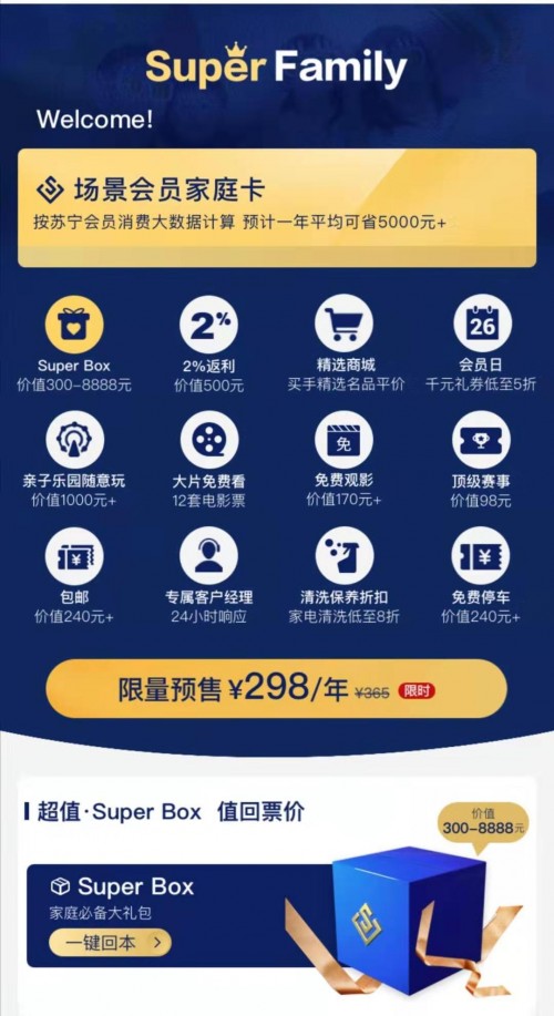 年初,苏宁易购推出 S UPER VIP专属会员特权,母婴家庭只需办理价值149元的 Super VIP会员卡,再加150元,即最高花费299元,就能在苏宁红孩子游乐不限时间、不限次数的玩上一整年。贯穿全年的红粉会员答谢会,通过海量母婴正品、专业的育婴师服务和特色会员福利活动圈粉超千万。而最新升级的苏宁Super Family会员更是以承包一家人的衣食住行为出发点,融合了苏宁体育、苏宁影城、苏宁金融、苏宁红孩子、苏宁广场等业态,共12项特权,发力会员场景零售,打造了完善的会员生态服务。