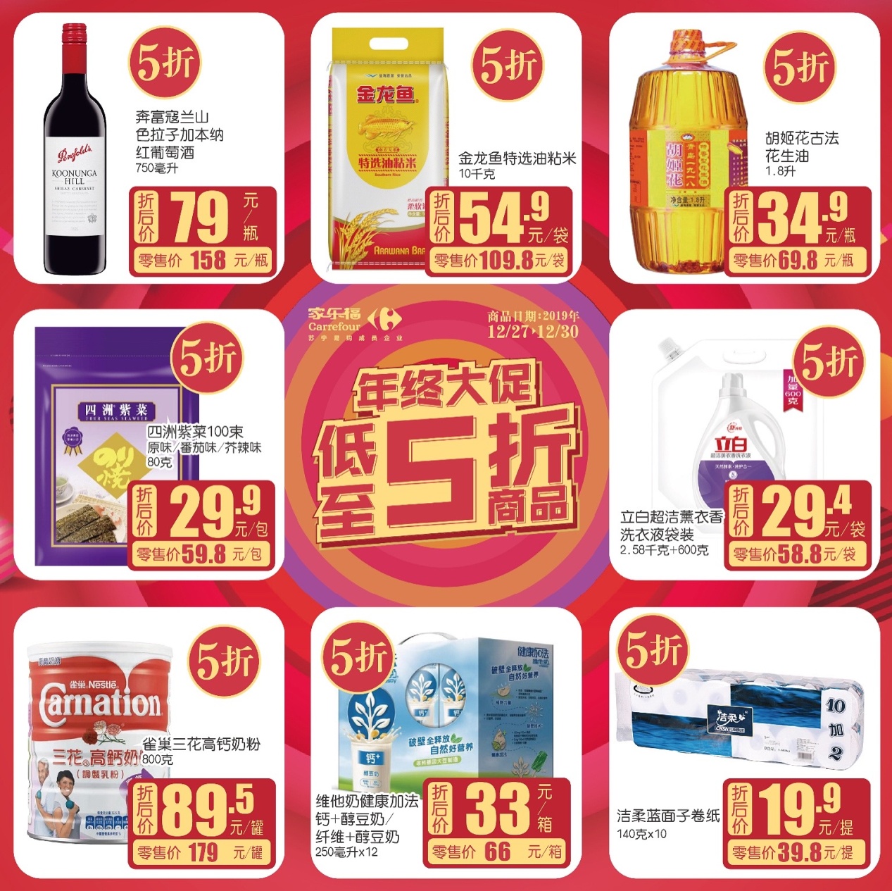 5折杂货篇:爆款奔富寇兰山色拉子加本纳红葡萄酒、金龙鱼特选油粘米、胡姬花古法花生油、四洲紫菜、雀巢三花高钙奶粉、立白超洁薰衣香洗衣液、洁柔蓝面子卷纸……民生致爱家乐福全知道,满足您方方面面的需求!