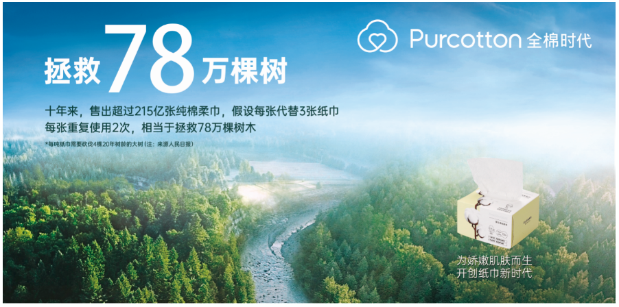 产品之外,全棉时代也是棉花绿色发展产业链的重要推动者,10年来,全棉时代采购近10万吨棉花,累计售出全棉服装、床品1300余万件,售出纯棉柔巾超过215亿张,相当于拯救树木78万棵,共发出全棉无纺布环保购物袋680万个,避免了等量塑料袋的使用。