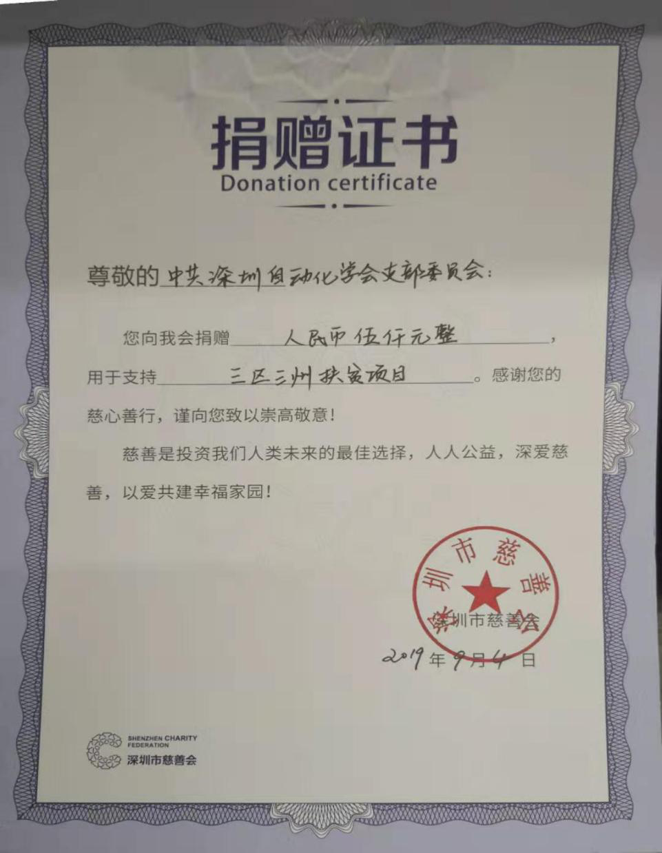 作为深圳成立最早的协会,深圳自动化学会一直将学会的党建工作列为重点,适时开展活动,让学会中企业单位暂无党组的流动党员们有一个“温馨的家”。2019年,深圳自动化学会先后组织的活动有:组织会员单位的入党积极分子参加了深圳市社会组织第一期发展对象培训班;组织会员单位党员集体参观有关深圳改革开放40周年的专题展览《大潮起珠江》;组织会员单位积极开展扶贫捐赠活动,有捐款、有图书,还有电脑等教学设备,受到了相关单位的表彰和肯定。