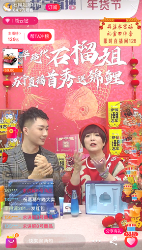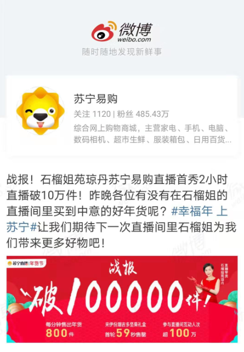 2020年伊始,“风华绝代”的石榴姐苑琼丹在苏宁易购开始了新年带货直播首秀,为全网用户推荐实用年货,超过100万人“围观”了直播,两小时带货超10万件,平均每分钟售出800件年货,其中最受消费者欢迎的来伊份潮吉多坚果礼盒59秒售罄,创下2020年明星带货的新记录!