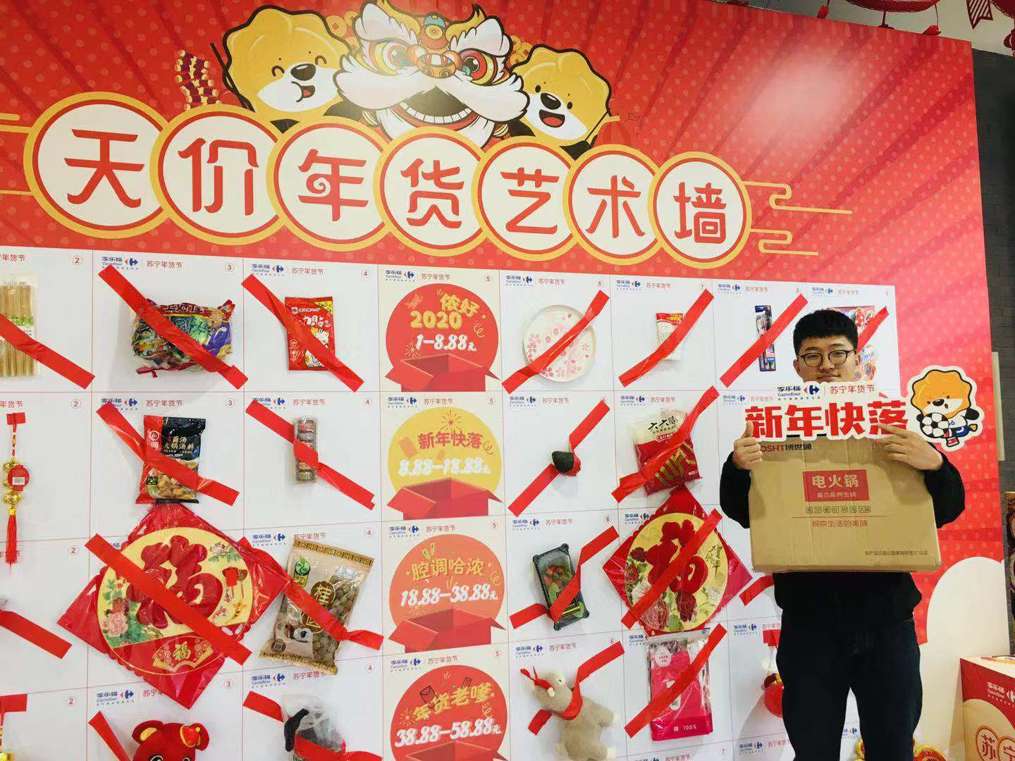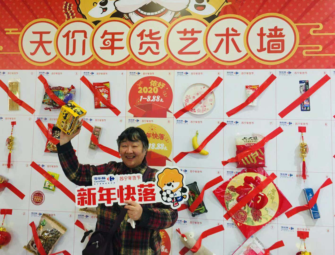 1月10日上午,记者来到家乐福“年味哈浓”天价年货艺术墙的活动现场,众多市民正想跃跃欲试。记者发现,在天价年货艺术墙上,有侬好2020、新年快落、腔调哈浓、年货老嗲、“鼠”侬最美五类天价年货。