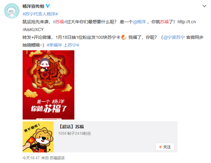 苏宁代言人杨洋和江疏影也给大家带来了不少福利,粉丝们继续喊话爱豆,“过年就差一个杨洋了,万一实现了呢”。苏宁家电直接开启鼠运来袭模式,粉丝参与微博互动,就有机会获得2020元苏宁红包,还能获得杨洋同款SKG按摩仪。