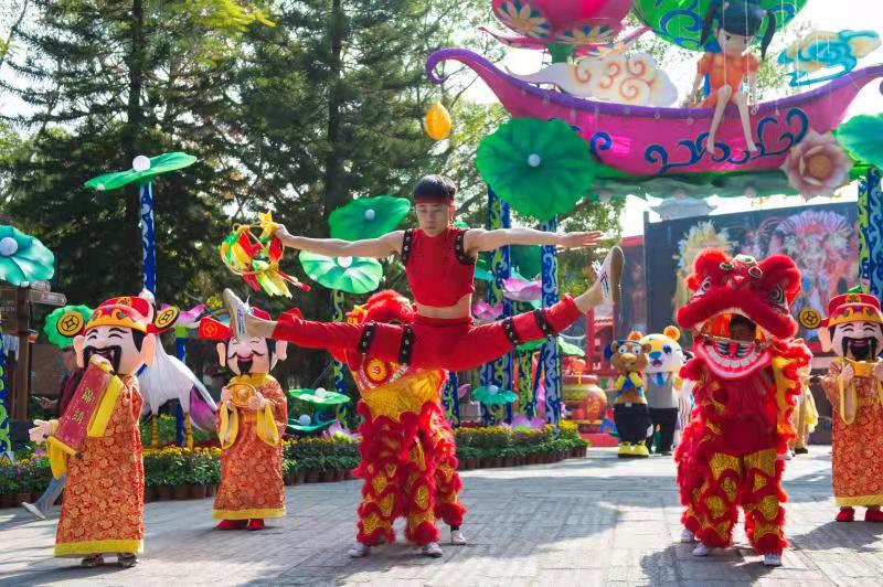 景区内年味儿正浓,灯笼、对联、窗花挂满园,雏菊、月季、蝴蝶兰等百花齐放,满园春意盎然。当然,最精彩的莫过于逛庙会!大年初一到初六,锦绣中华春节大庙会即将承包全家人的欢乐贺岁。相声、快板、评书妙趣横生;京剧、双簧轮番上演,近距离体验国粹文化。点狮成金,好运连连,景区携手非遗舞狮团,将带给游客最精彩的梅花桩舞狮表演。一支由财神送宝、十二生肖、杂技戏耍、京剧舞团等十几组独具年味特色方队组成的“庚鼠大巡游”队伍,也争相给游客送上新春祝福!