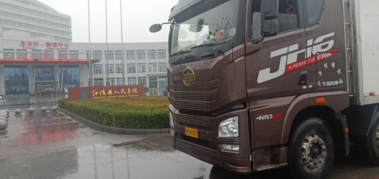 2月1日,令狐师傅连夜从南京出发,满载消毒剂、防护服、口罩、医用手套、医疗垃圾桶等重达12吨前线急缺物资,途径武汉、荆州、襄阳、十堰,将武汉中医院、江陵县人民医院、襄阳市中西医结合医院三家医院的救助物资送到后,已是2月2日晚上21点,他又直接前往十堰医院运送手套。