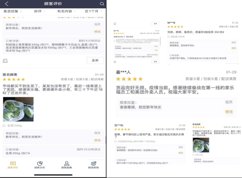 拣货、核对订单、打包、再次确认商品无误,在规定时间内将商品给到外卖骑手……这是一项挑战体力与脑力的“细致活”。为了维持家乐福“3公里内、1小时速达的配送到家”服务顺利运作,每天,家乐福门店的电商主管还需要协调不同部门的值班员工通力合作。由于春节期间人员紧缺,超市一线员工几乎每天都在与时间赛跑。“以不变应万变,在这场战役中不断的完善不断的调整,每一分每一秒都是十足宝贵的。”黄福填说,虽然没有回家过年,但看到顾客们一致的好评留言,自己心里非常高兴。“顾客的好评就是对我们工作的最大鼓励和认可。”