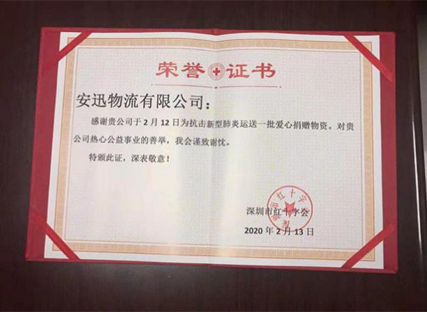 当到两处捐助地点收集好物资后,国美物流车辆到达深圳市疾控中心已是下午两点多,一路上两人水米未进,尽力保证捐赠物资的及时到位。深圳市红十字会为国美安迅物流发来了荣誉证书,对他们及时运送爱心捐赠物资的善举表示感谢。