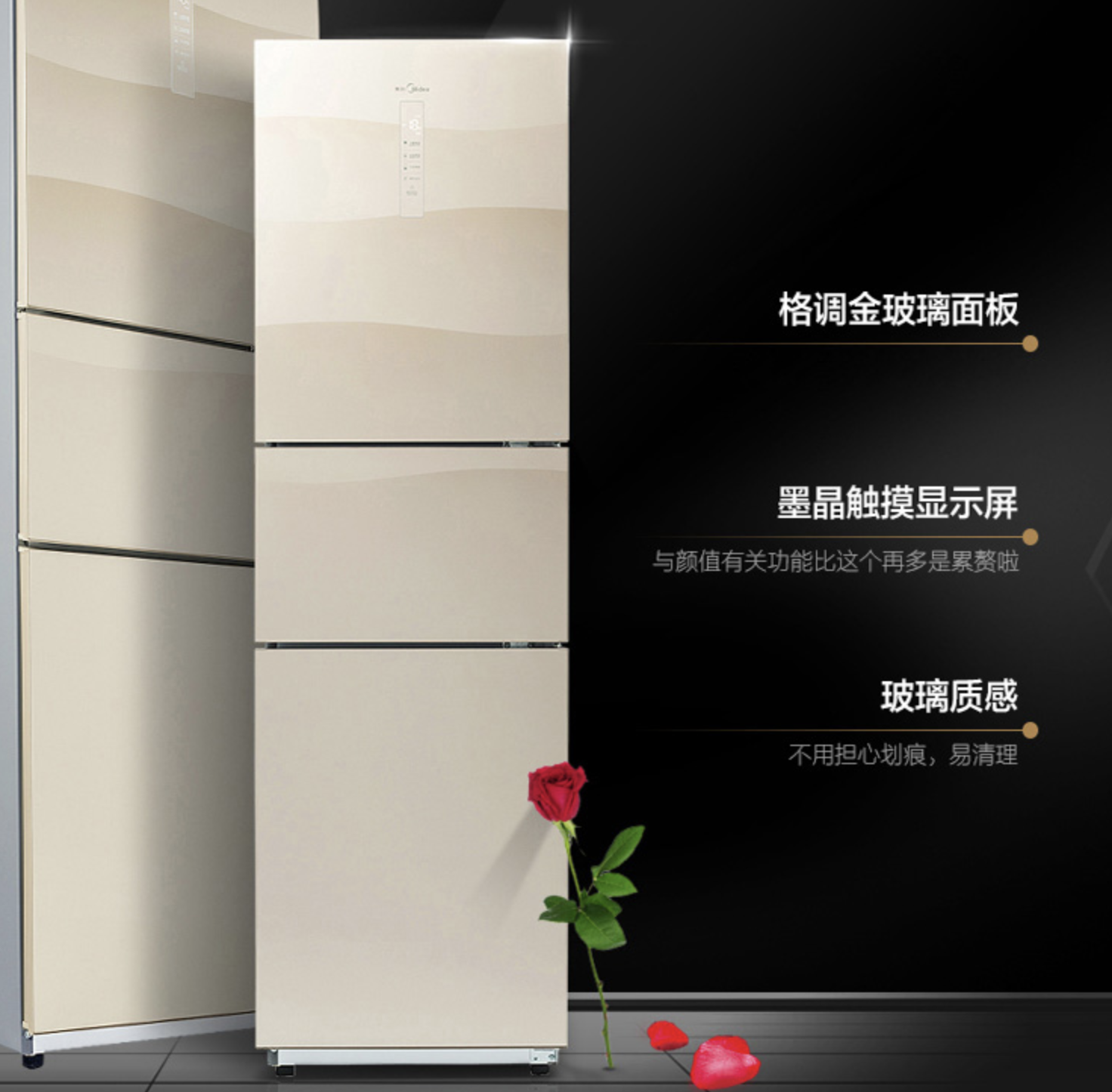 美的这款BCD-239WTGM三开门冰箱,产品采用金色玻璃面板与墨晶显示屏,杜绝划痕更有质感,宽门设计、 隐藏暗把手、三温区黄金比例。这款产品三温区可单独控温,分为121升冷藏室、38升变温室和80升冷冻室,让储鲜多样化。此外,风冷无霜减轻手动除霜的负担,保持食物原始口感。