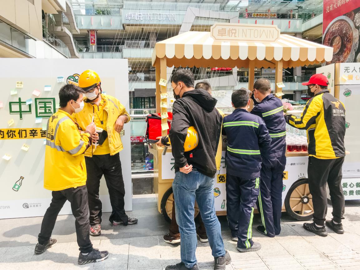3月3日至3月8日卓悦INTOWN在街头专设了一个”无人值守爱心站”,用爱心餐车上放满了食物冷/热饮,专门免费赠送给快递、外卖小哥、环卫工人、警察、城管等一线奔波的人员。