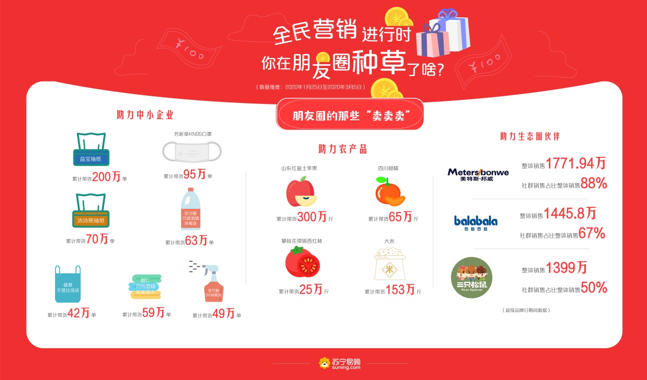 为有效解决农产品销售问题,也同步解决居民的“菜篮子”“果盘子”“米袋子”,苏宁利用社群营销帮助农民卖出超千万斤农产品。据苏宁大数据显示,苏宁推客累计带货山东红富士苹果300万斤、四川柑橘65万斤、攀枝花滞销西红柿25万斤、大米153万斤等,成功搭建了农产品流通的桥梁,促进了农产品上行,为战“疫”胜利奠定了坚实基础。