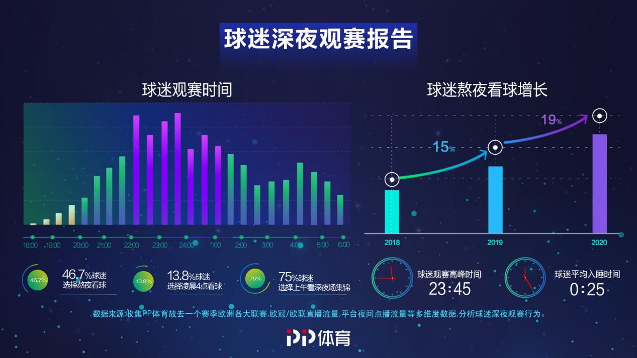 见圳客户端·深圳新闻网2020年3月24日讯 随着世界睡眠日的来临,“熬夜”这一话题再次成为大家关注的焦点。近日,PP体育发布《球迷深夜观赛报告》,勾勒出球迷用户的睡眠画像。数据显示,球迷熬夜看球比例逐年升高,有46.7%的球迷会选择0点后熬夜看球,看球高峰出现在23点45分,平均入睡时间要到0点25分,而北方城市基本告别熬夜看球,只有北京一座北方城市挤进熬夜指数前10名。