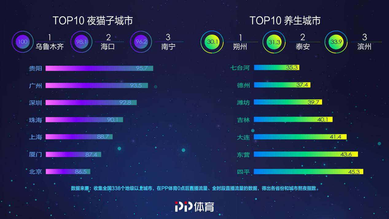 PP体育还通过收集分析了全国338个地级以上城市用户的观看数据,得出了全国省市和城市的熬夜指数。透过这份报告,我们能看出原来地域不同的熬夜情况存在着极大差异。从全国各省份熬夜观赛的球迷分布来看,由于新疆与北京时间有两小时的时差,凭借天独厚的地理优势,新疆球迷自带熬夜光环,成为全国熬夜大赛冠军。其他进入前五名的省份被南方省份包揽,分别是贵州、广西、广东和福建,南方球迷无疑是熬夜看球的主力军。