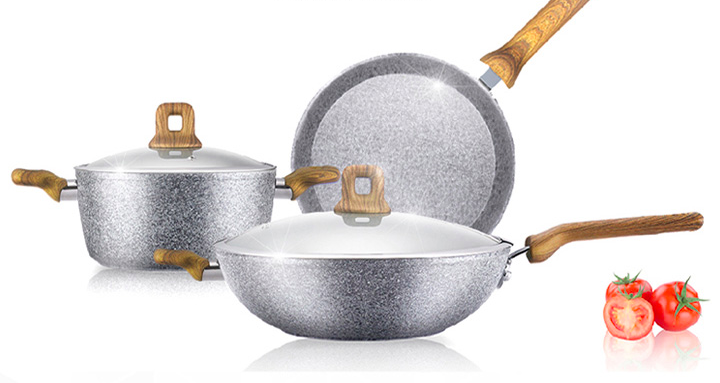 满足炒、煎、炖多种需求,一套高品质、高颜值的锅具相信你一定不会拒绝。三禾锅具三件套 T606是膳石犀利花岗岩健康不粘锅,采用花岗岩纳米起点,不粘更持久,耐磨性更高,堪称品质首选。除此之外,其还拥有五层技术工艺,并采用一体成型设计,质量颜值双升级。原木纹手柄,防霉防烫;钢化玻璃盖,密封防溢;节能复合底受热均匀。三件套内包含炒锅、煎锅、炖锅。