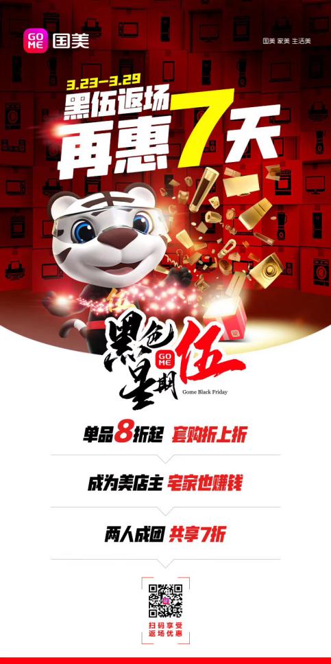 据了解,3月23日-3月29日,国美零售“黑伍”返场,再惠7天。在此期间,国美多种优惠玩法悉数上线。用户将不仅享受单品8折起、套购折上折的优惠,成为美店主,还能宅家赚钱,享受商品返利。此外,还有两人成团,共享7折等,快来国美美店厨饮专场选购吧。