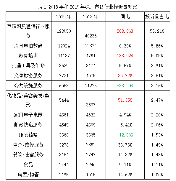 2019年,深圳市消委会共收到互联网及通信行业服务相关投诉123950宗,占全年投诉总量的56.21%,与去年同期相比增长208.06%,投诉增量主要来源于深圳市腾讯计算机系统有限公司(以下简称“腾讯公司”)。