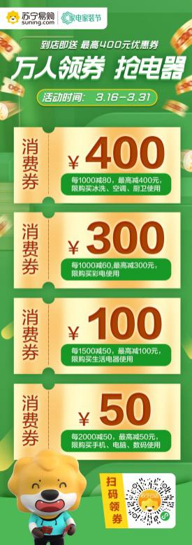深圳苏宁针对整个粤东区域投放近20万张消费券,该券根据可用产品类型分为400元、300元、100元、50元四种不同面值。消费券以电子券为形式发放,消费者可通过深圳苏宁微信公众号、深圳苏宁官方微博、苏宁云店小程序和苏宁易购门店进行领取,领取成功后,消费券将自动存储在消费者的苏宁会员账户中,使用时系统会根据购买的商品类别进行自动适配和抵扣结算。