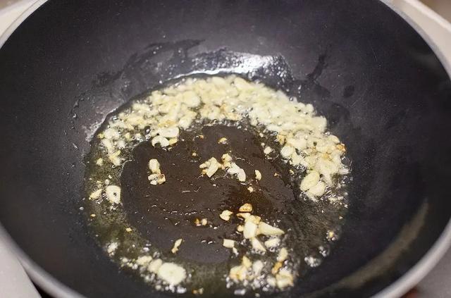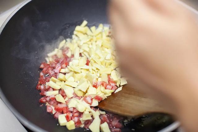 3.热锅下油,放入蒜头爆香,然后倒入笋丁、腊肠丁、雪菜翻炒。