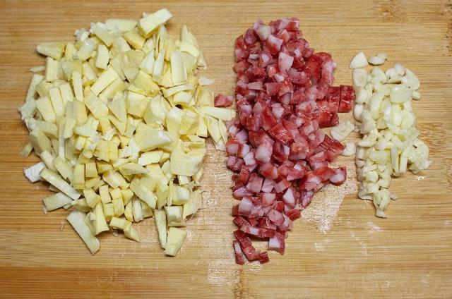 2.雪菜多洗几遍,避免太咸;笋、腊肠、蒜头切小丁;笋丁焯一下水去除涩味。