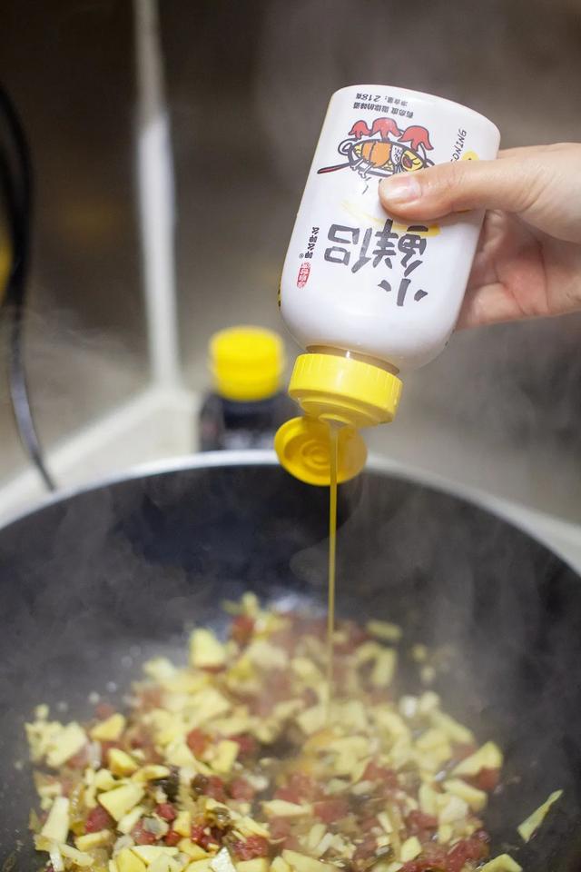 4.加入适量小鲜侣、酱油心生调味。腊肠、雪菜本身就会咸,不用再加盐,食材炒熟即可出锅。