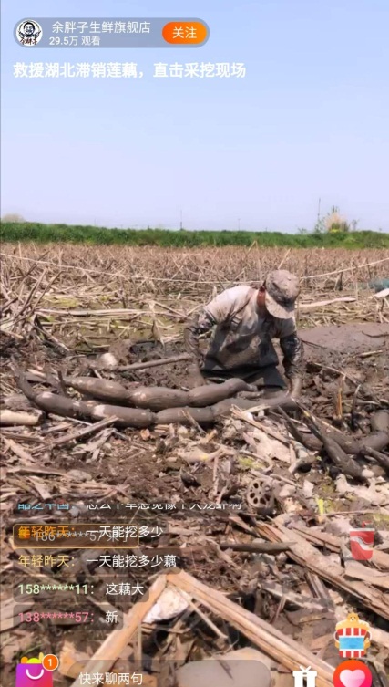 除了湖北的县长、市长外,普通的湖北商户不甘落后。8日上午,荆州洪湖的阳光明媚,“余胖子生鲜旗舰店”的店主便打开手机接通了直播,朴实的农民性格让他面对镜头一时不知该说什么好,简单问好后,他就转身下了塘,开始从厚重的泥土里拔出一根根新鲜的莲藕。有不少00后网友是第一次见到挖藕的过程,他们发现原来洁白爽口的大藕居然是从泥中挖出来的,“挖藕真的太不容易了,一个上午要泡在塘泥里。”