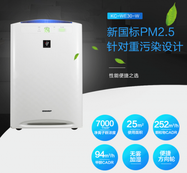 夏普 KC-WE30-W采用的是简洁大方的外观设计,产品尺寸为393mm*270mm*603mm,净离子群结合滤网的净化方式,能够有效去除甲醛,PM2.5以及其他有害细微颗粒物。这款产品具备特有的净离子群空间净化技术,对霉菌和病毒的杀灭有很大帮助,最后离子会形成水返回到空气中。