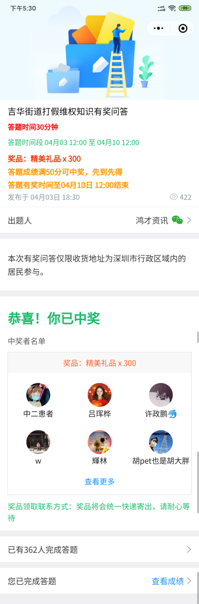 见圳客户端·深圳新闻网2020年4月14日讯 近日,吉华街道经科办组织开展的消费者打假维权有奖问答活动圆满结束。此次活动通过辖区内各园区及各社区居民小组微信群广泛宣传,覆盖近万名辖区居民。