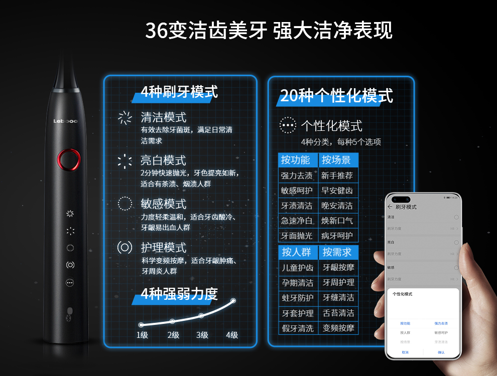 值得一提的是,力博得智能声波牙刷·星钻内置压力传感系统,具有36种洁齿档位,4种洁齿模式和4级力度调节。强劲清洁模式:满足日常清洁需求;抛光亮白模式:适合追求亮白人士;温和敏感模式:适合牙龈易出血人群;轻柔护理模式:为牙病问题而生,体贴入微。以上模式各有1-4级力度调节,更加人性化。
