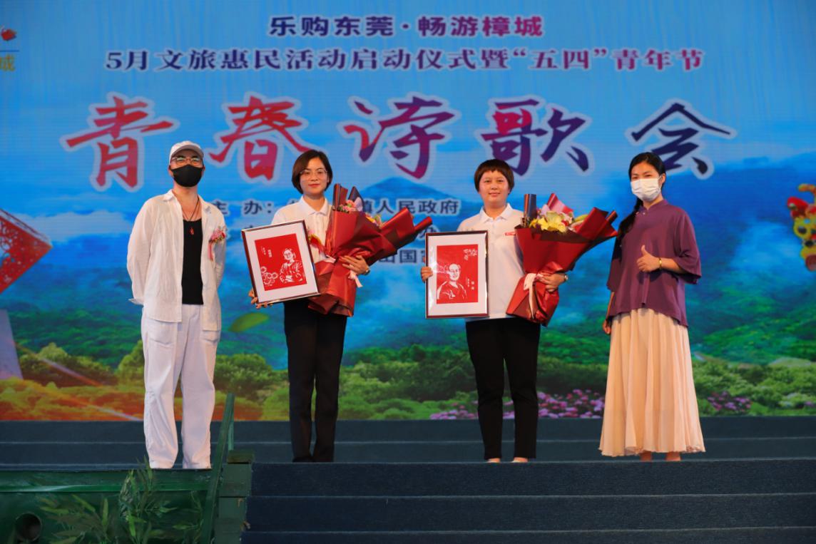 活动主办方当天邀请了2名来自樟木头医院的援鄂英雄ICU副主任护师黄新武和门急诊主管护师贺希,分享援鄂抗疫事迹及经历。2位援鄂医护人员表示,“带着医院的嘱托和东莞市人民的期望,我们顺利完成了任务,平安回来。在五四青年节之际,通过这次抗疫经历,希望医护青年能将救死扶伤的精神传承发扬下去,也希望青年们能更加从容、更有底气地迎接未来,实现人生的价值。”游客们纷纷以热烈的掌声向他们的英雄壮举表达敬意。东莞市民协艺术家杨文忠为2位援鄂英雄献上了肖像剪纸艺术作品,表达由衷的敬意。