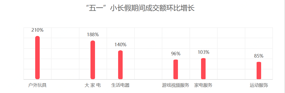 “五一”小长假期间,国产商品的成交额同比增长了52%。国产的生鲜产品十分丰富,农产品触网利用信息经济快速的将地方市场转化为全国市场,成交额同比增长了148%。此外,国产的家电、农资园艺、清洁用品及厨具的成交额同比增长较高。
