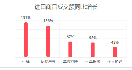 随着人们生活水平的提升,进口生鲜成交额同比增长了151%。近几年,进口生鲜的价格门槛下降,尤其是进口的奶制品、猪肉、牛肉的价格跟国产商品十分接近。此外,借助于品牌优势,进口的运动户外、美妆护肤、玩具乐器、个人护理等商品的成交额同比增长也比较高。