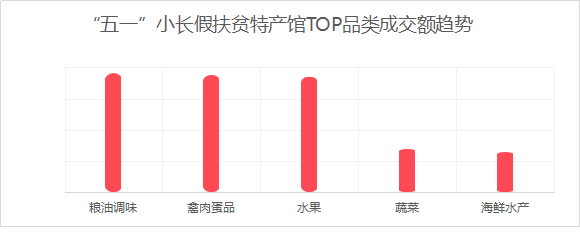 借助“五一”小长假及线上消费增长的势头,各地的线上扶贫特产馆成交额同比增长了135%。各产地的粮油调味、禽肉蛋品、水果、蔬菜及海鲜水产等特产的成交额最高。