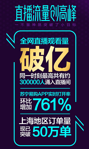 为支持上海五五购物节,苏宁在20亿消费券的基础上,将为上海消费者推出“超级百亿补贴”,还将通过额外发放“爆品专属补贴”“分期免息补贴”“以旧换新补贴”等让利补贴,力促上海消费回暖。直播当晚,共计发出5亿消费券。