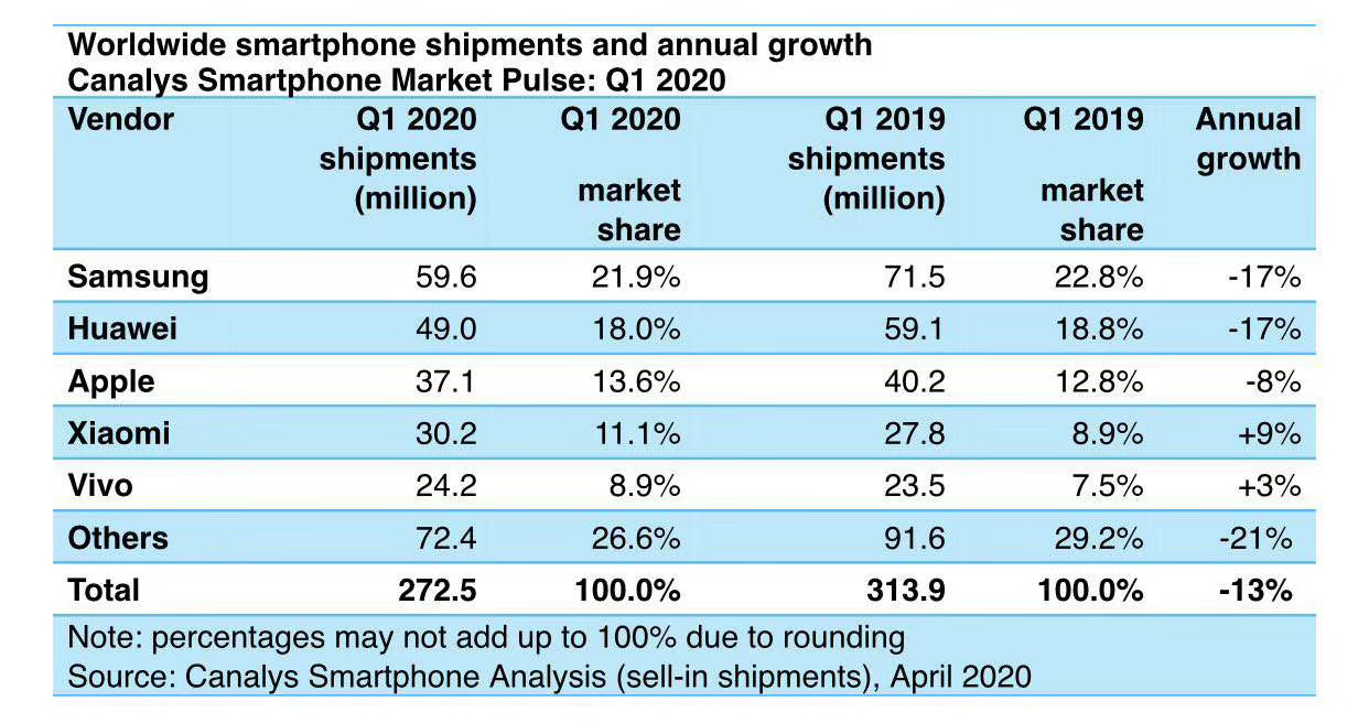 见圳客户端·深圳新闻网2020年5月6日讯 国际权威机构IDC最新报告显示,全球智能手机出货量在2020年第一季度同比下降11.7%。其中,三星、华为、苹果依旧稳居前三,分别为21.1%、17.8%和13.3%。