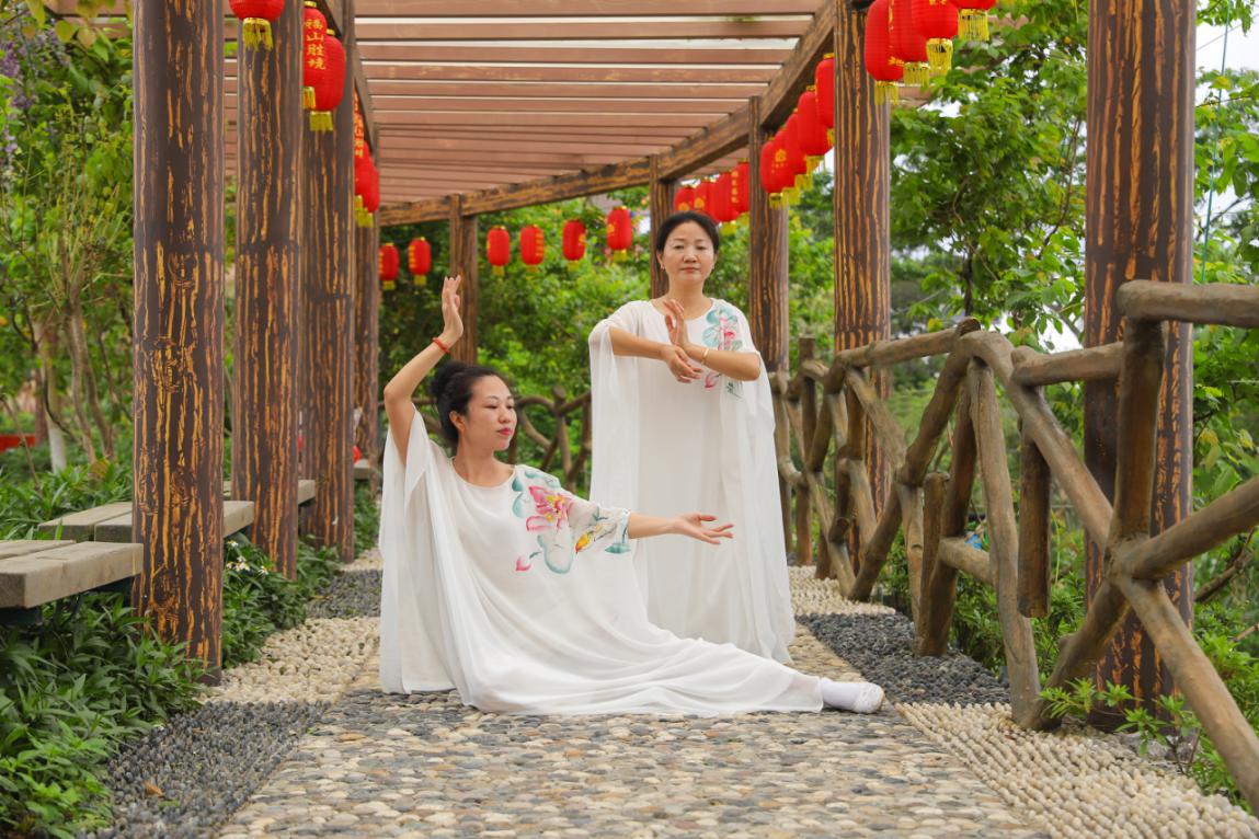 在清幽密林中,舞者们身着宽松飘逸、传统文化气息浓郁的素衣,伴随着《遥远的妈妈》、《琵琶吟》、《天边》、《洁白的仙鹤》、《鸿雁》、《慈祥的母亲》等舒缓柔美的音乐,在治愈清凉的呆萌文化艺术长廊、福气满满的天下第一福、清新清幽的健康福道、福韵美满的吉祥苑、古香古色的雅清苑中,以群舞、双人舞、独舞等各种形式在青山绿水间翩翩起舞,舒展着身体,舞姿轻柔自然、柔雅流畅。舞者们只需跟随音乐,用自如的舞蹈动作,将内心清净自然的情感,简单直接的表达出来,融入自然间,觉知身、心、气、乐、境而舞,刚柔并济,现场氛围宁静、平和。其中一位来自惠州的妈妈介绍,平时确实忙碌于自己的家庭中,很难有真正属于自己的时间,“今天这个属于我们的节日里,在森林中放松身心,展示自己,这种修身养性的体验很特别。而且今天还能和这么多母亲一同度过母亲节实属难得,很特殊。”
