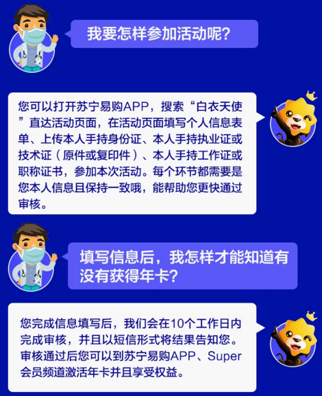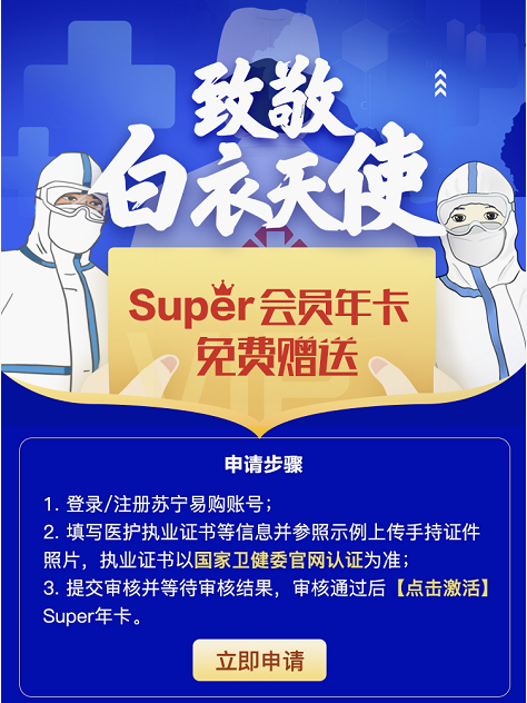 为表达对医护工作者的敬意,苏宁对全国医护人员开放SUPER会员免费申领活动。
