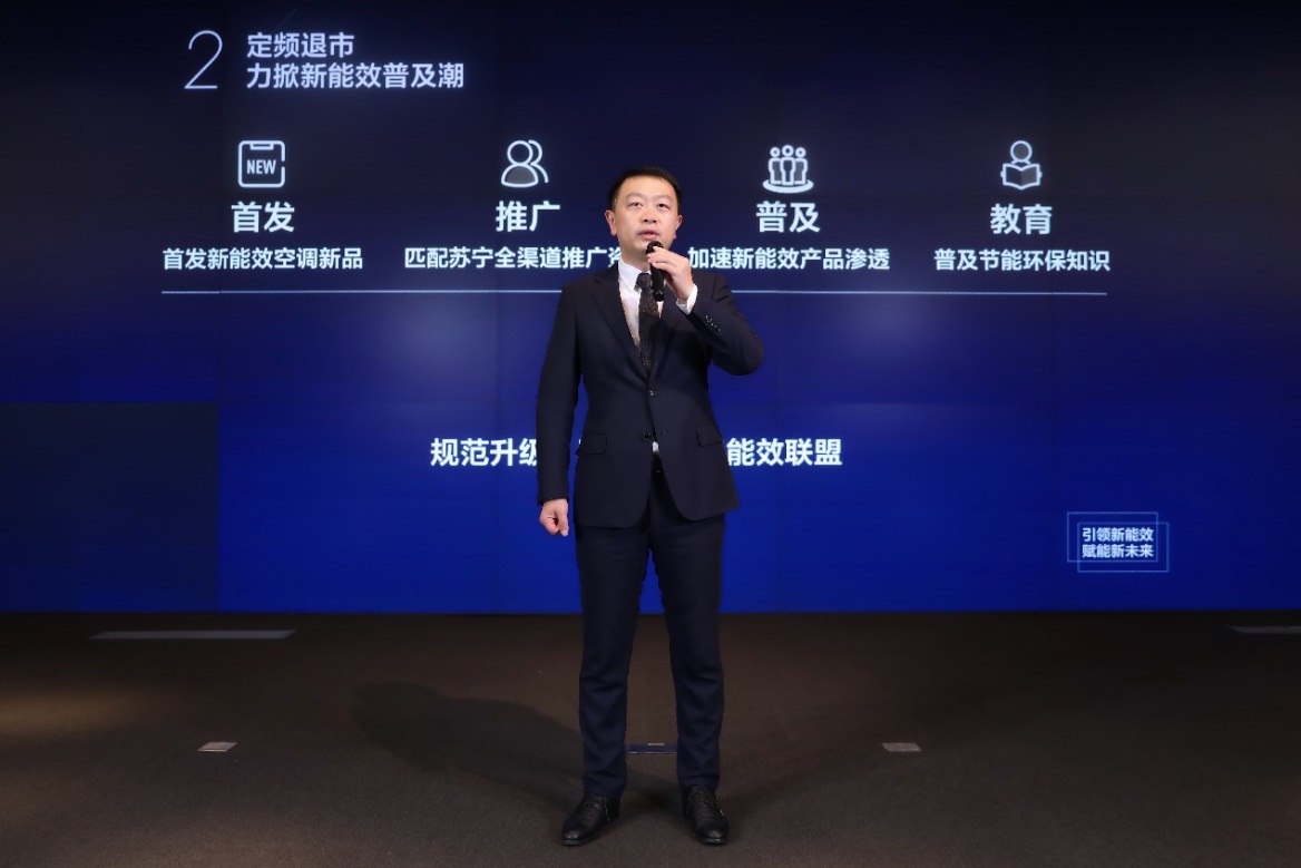 国家标准推动新能效空调进入普及快车道的同时,苏宁作为家电第一渠道,也在积极通过绿色消费让利活动,加大新能效空调产品的推广。苏宁家电集团副总裁徐仲介绍说,去年8月,苏宁就启动了“定频退市”项目。今年将在此基础上多重加码,一方面联合各家空调企业,成立“新一级能效联盟”,加速新能效空调的研发与推广;另一方面持续开展“空调节能风暴活动”,涵盖包括老能效清仓、新能效补贴、以旧换新和24期免息在内的四重补贴,从而加速新旧能效产品的切换,降低新能效空调的消费门槛。